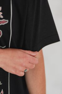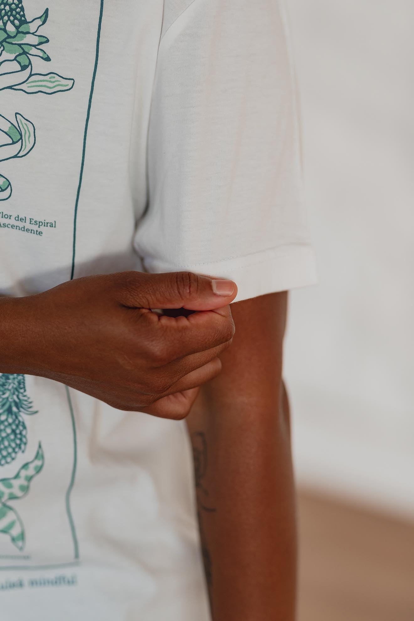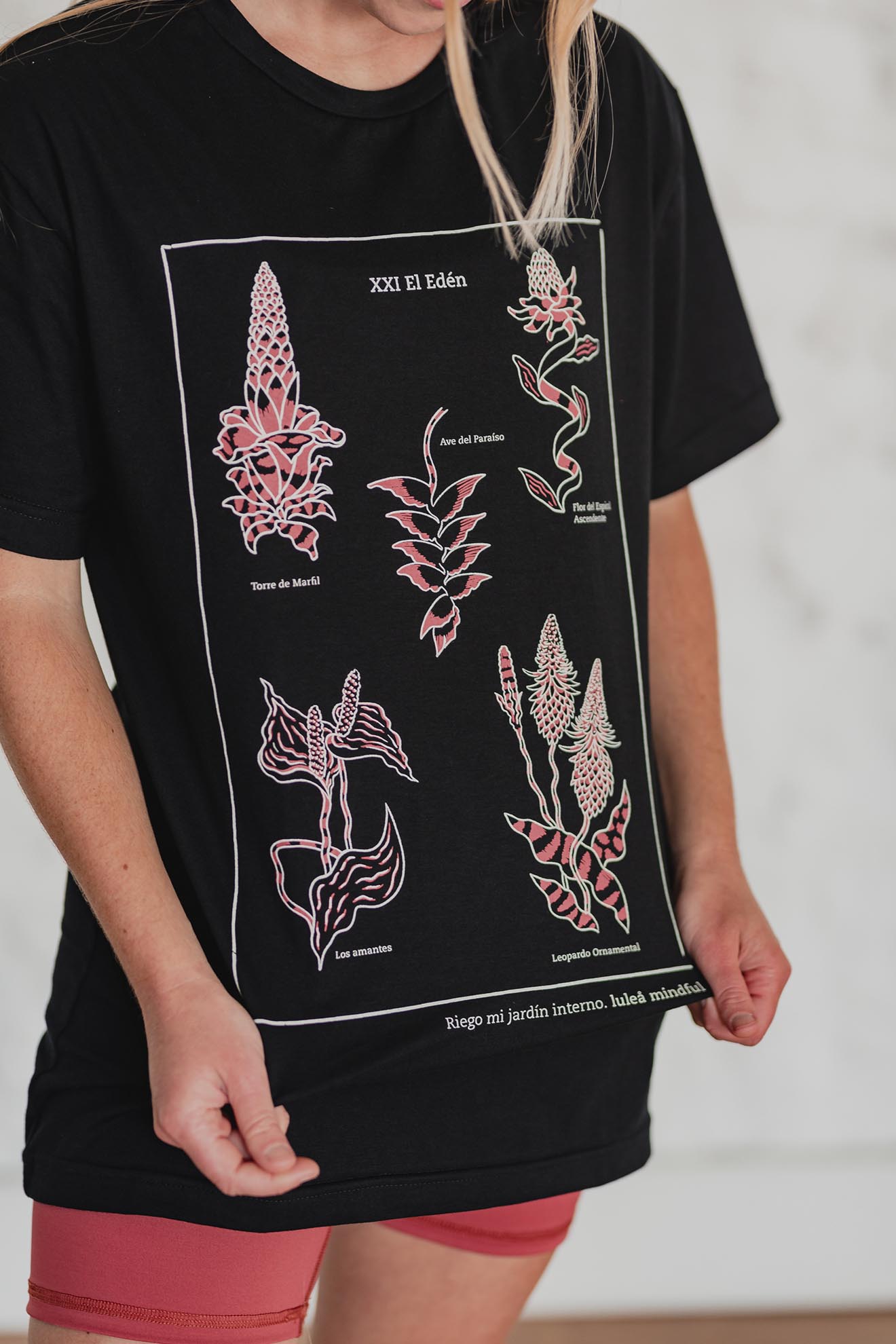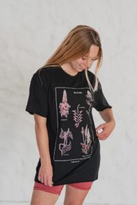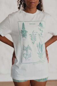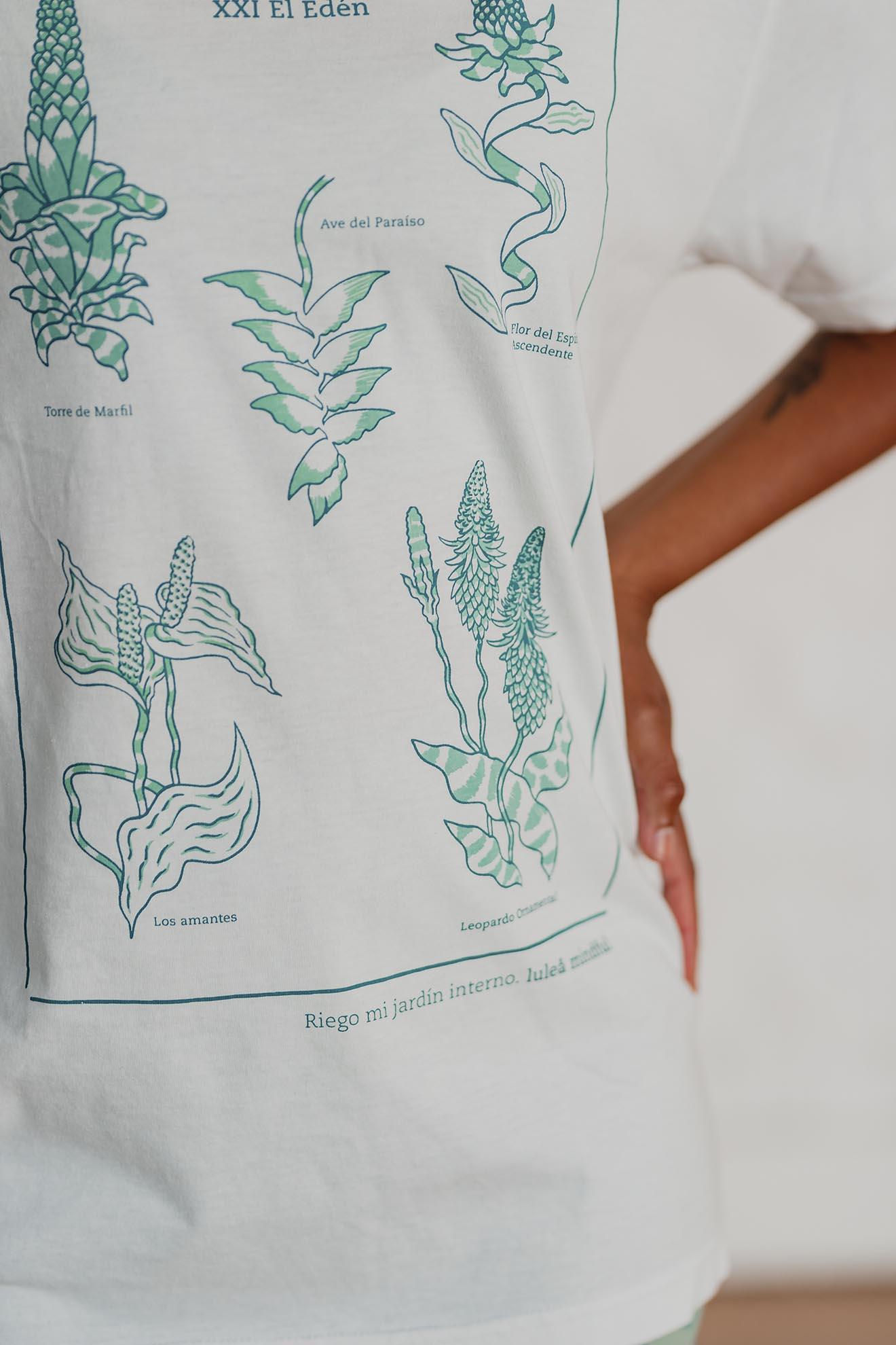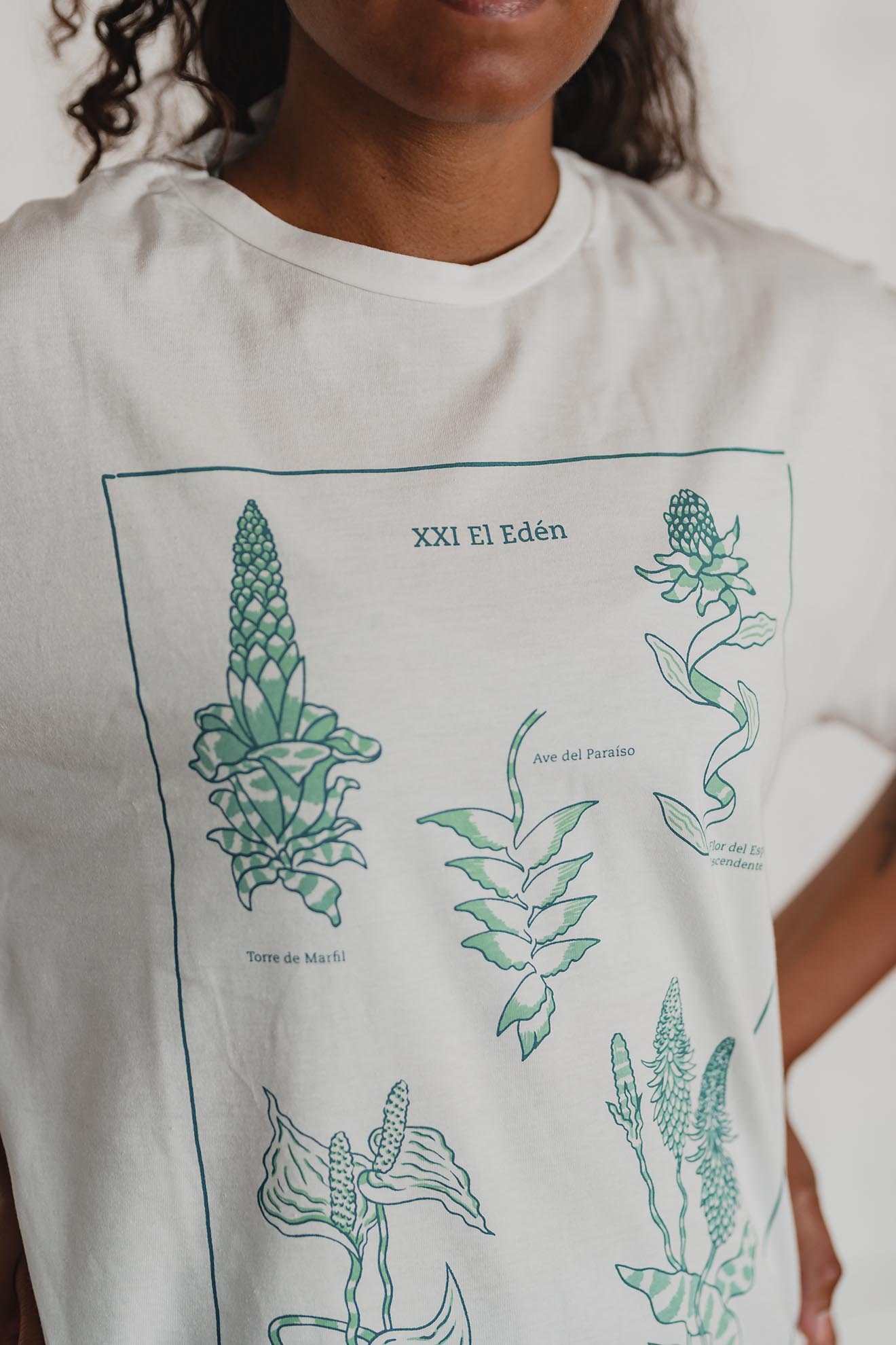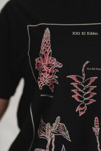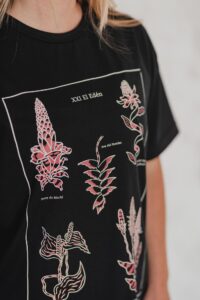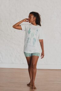 Está confeccionada íntegramente en jersey de algodón, un tejido respirable y suave al contacto con la piel. Trae una estampa hermosa al frente realizada en serigrafía artesanal con tintas al agua.